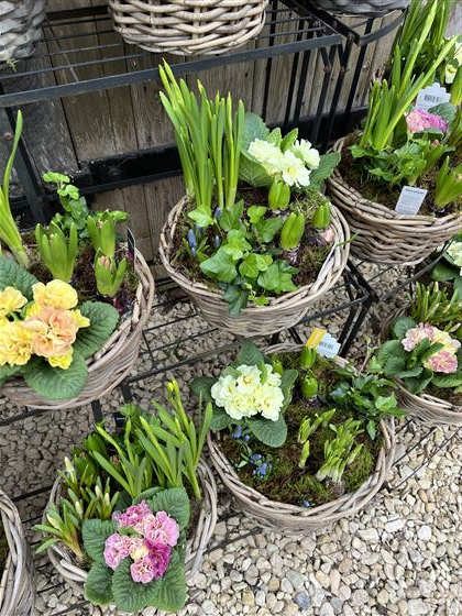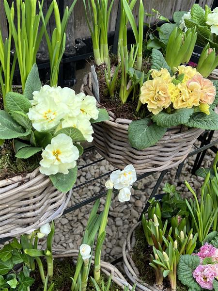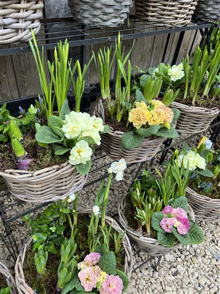 A rattan basket planted with spring bulbs and flowers.